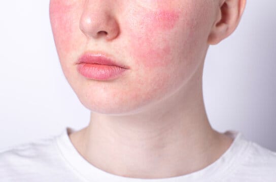 - Rougeurs persistantes sur les joues, le nez, le front ou le menton.